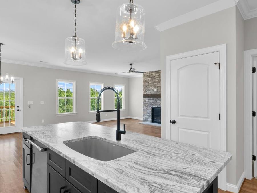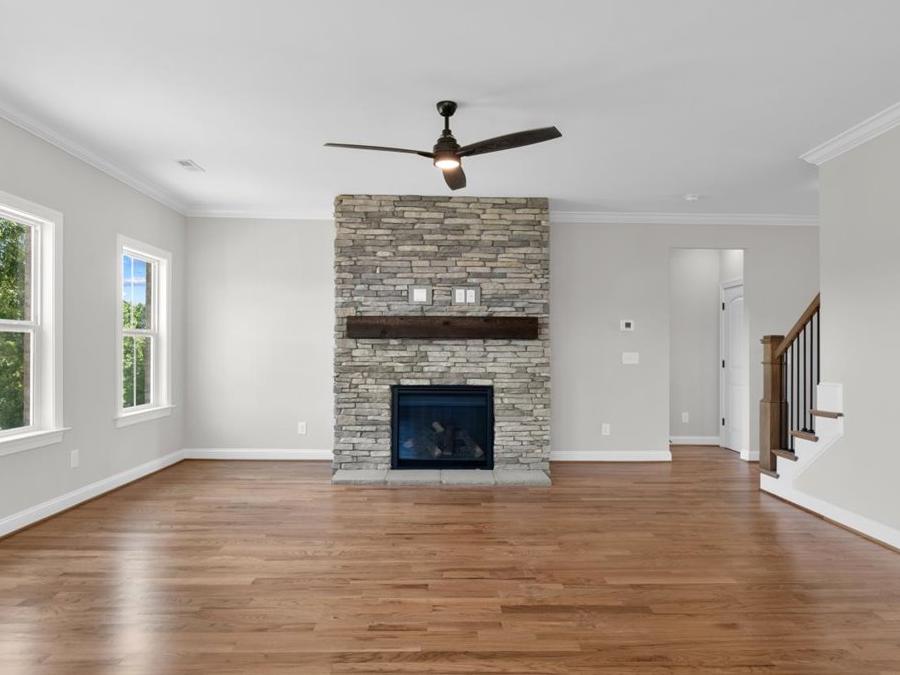 As you step through the covered front porch into the foyer, a sense of warmth greets you. To your right, a powder room offers convenience before you enter the expansive great room. The great room is a focal point, adorned with a fireplace, seamlessly connected to both the dining area and the gourmet-styled kitchen, creating a cohesive and open-concept living space. Both the dining area and great room are bathed in natural light, creating an inviting atmosphere.