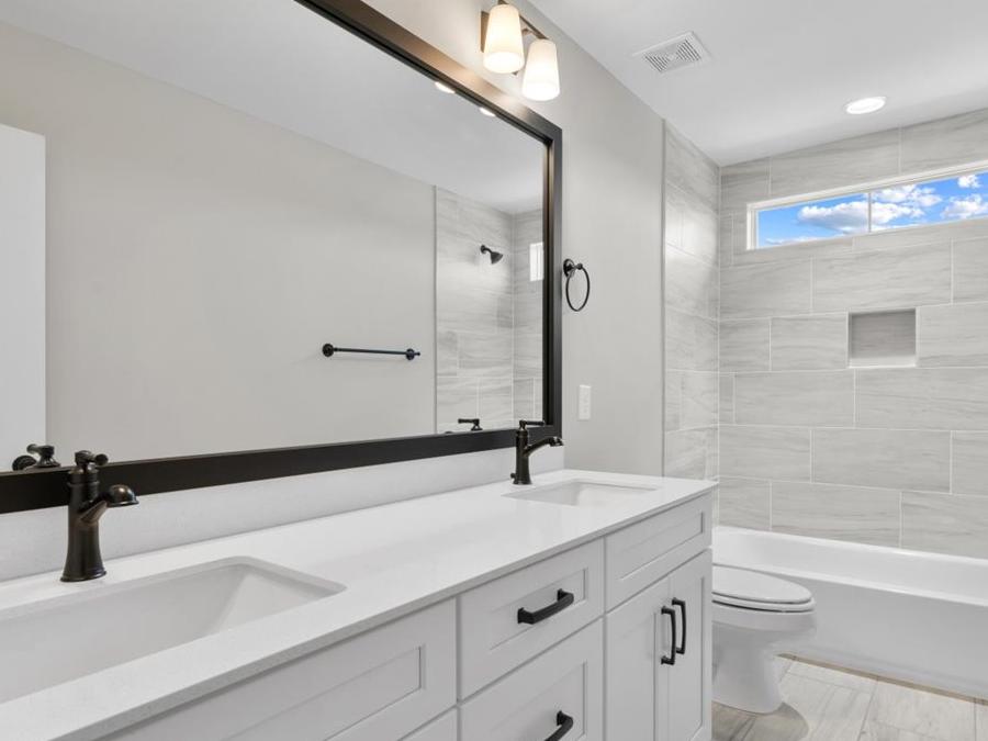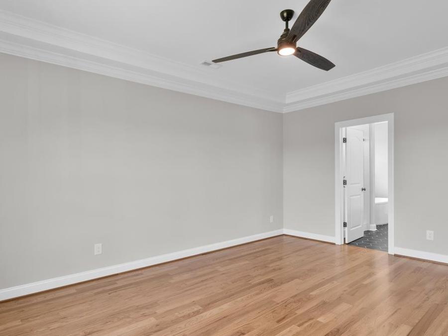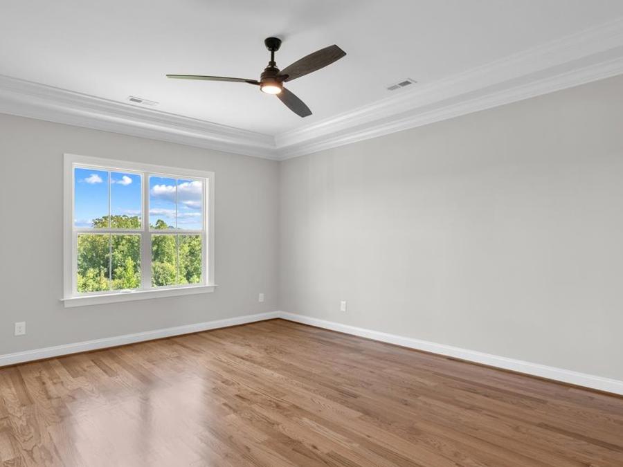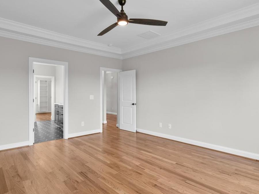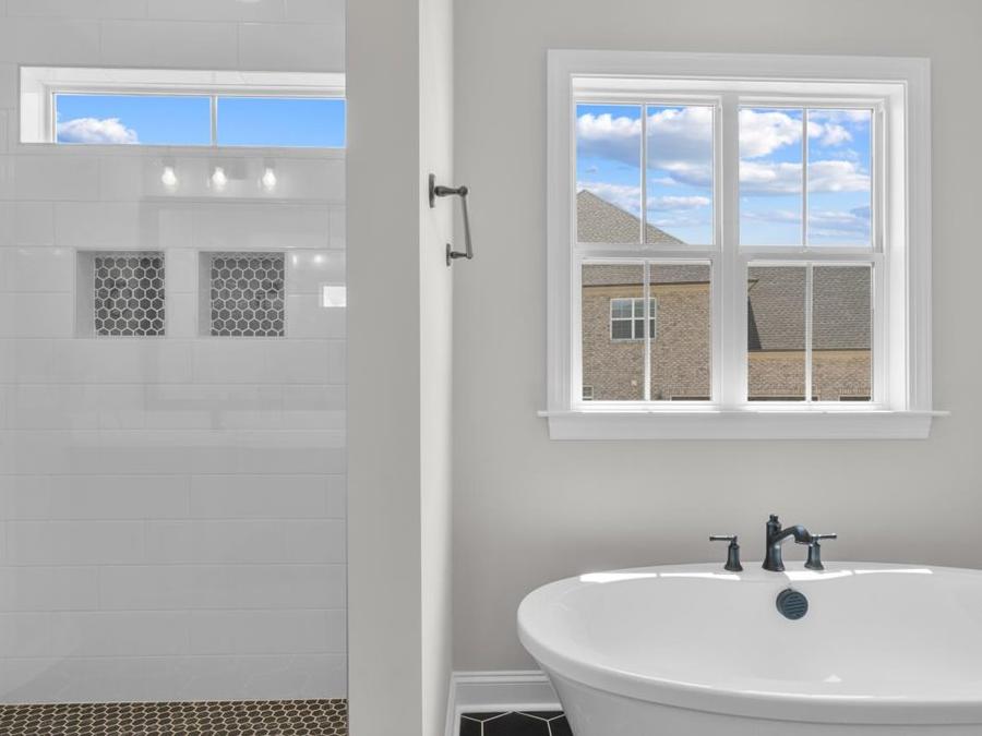 The primary bedroom on the main level is a haven of comfort, boasting custom 12" box tray ceilings. The primary bathroom is a luxurious retreat with dual sinks, a freestanding tub, a walk-in tile shower, a private toilet area, and a vast walk-in closet, providing both style and functionality.