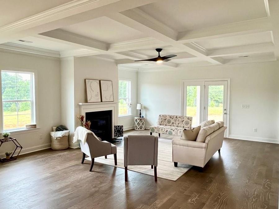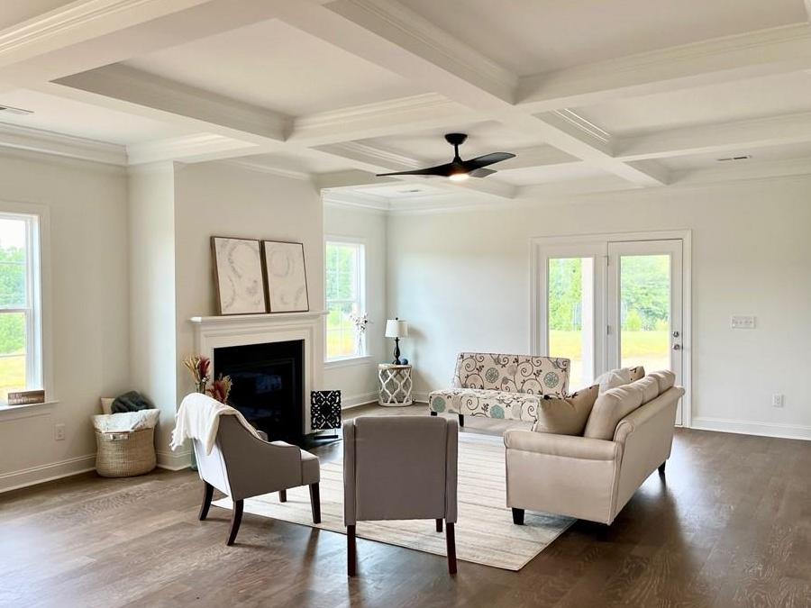 As you enter through the foyer, the first guest bedroom and a full guest bath create a welcoming atmosphere. The heart of the home unfolds with an open-concept design connecting the dining room, kitchen, and great room. The gas fireplace and coffered ceiling in the great room becomes a cozy retreat & adjoins French doors opening to the screened-in porch.