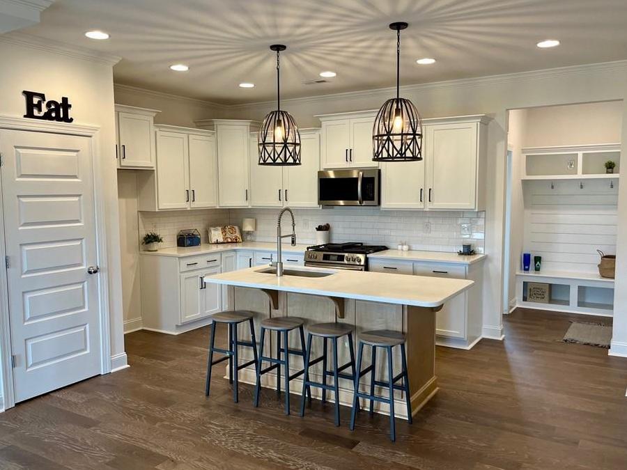 The kitchen features a large island, walk-in pantry, quartz countertops, and an abundance of counter space. A "drop zone" area off the kitchen ensures convenient organization, connecting the garage entry and the dedicated laundry room.