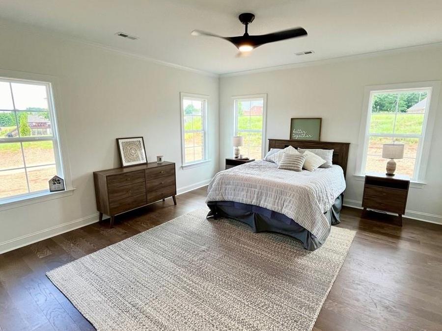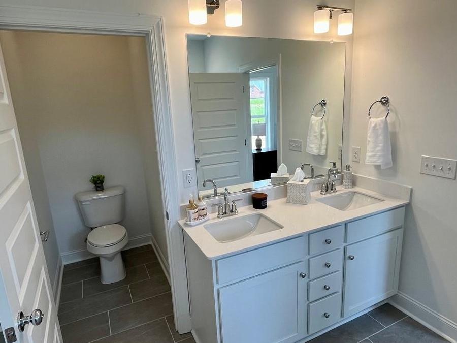 The primary bedroom, located on the main level, offers two walk-in closets, and a spa-like retreat in the primary bath. Dual sinks, a private toilet area, ceramic tile flooring, and a walk-in tile shower enhance the luxury. Eingineered hardwood floor extends from the main living areas into the primary bedroom.