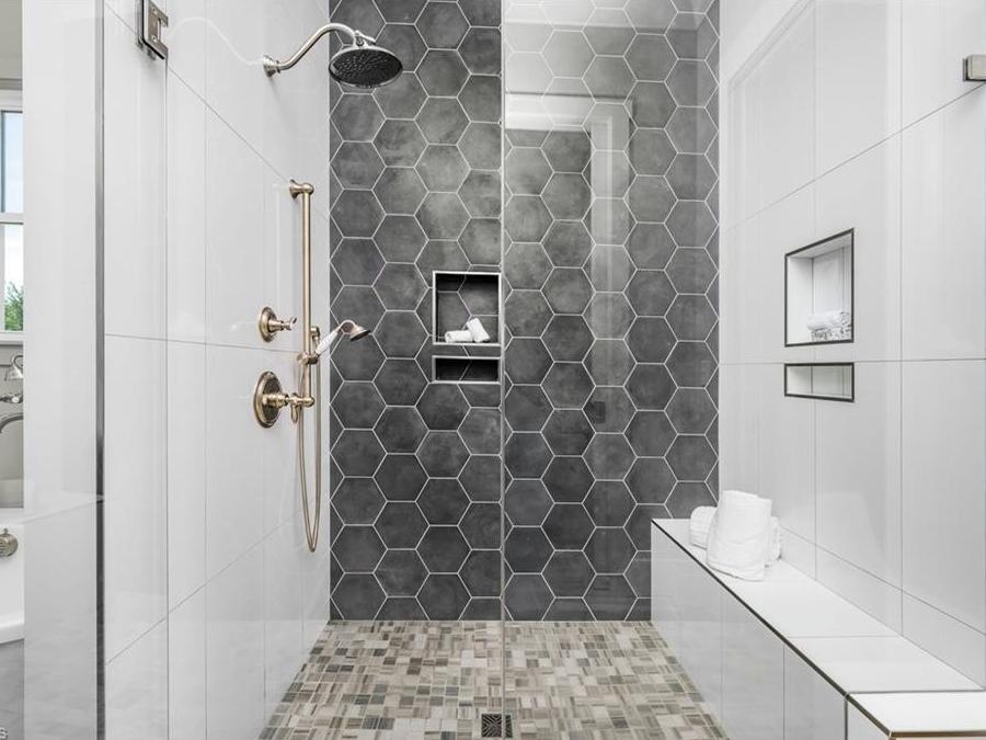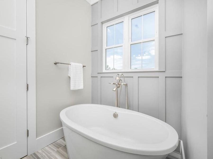 The primary bedroom is a retreat with a 12' raised tray ceiling and ample natural light. The primary bathroom boasts his and her sinks, a pocket door for privacy in the toilet area, a freestanding tub, and a walk-in shower.