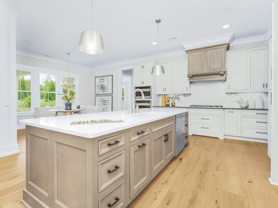 The kitchen area in "The Amberly" is a chef's delight, equipped with a 6-burner cooktop, an oversized island, a pantry closet, and a wall oven. Exiting the kitchen leads to an office flex space, providing additional functionality. This space connects to storage closets and the dedicated laundry room, complete with a built-in sink. The laundry room offers direct access to the massive primary walk-in closet, enhancing convenience in daily routines.