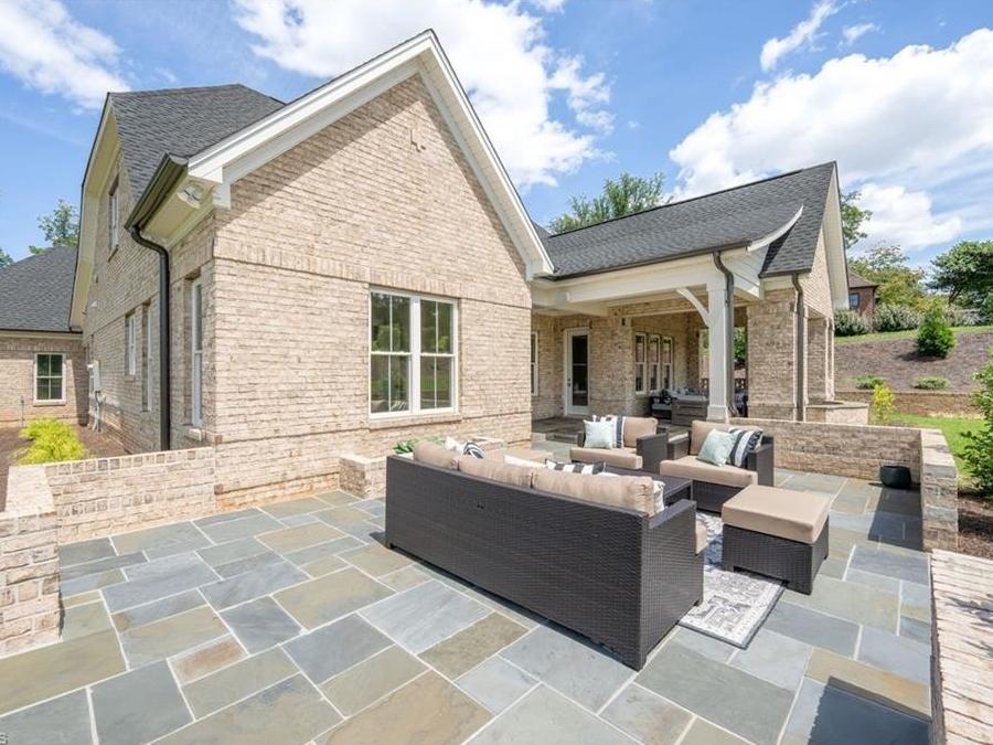 Continuing down the hallway, you'll step into the formal dining room. This room seamlessly connects to the spacious great room featuring a raised tray or coffered ceiling. A covered flagstone porch, accessible from the great room, extends the living space outdoors.